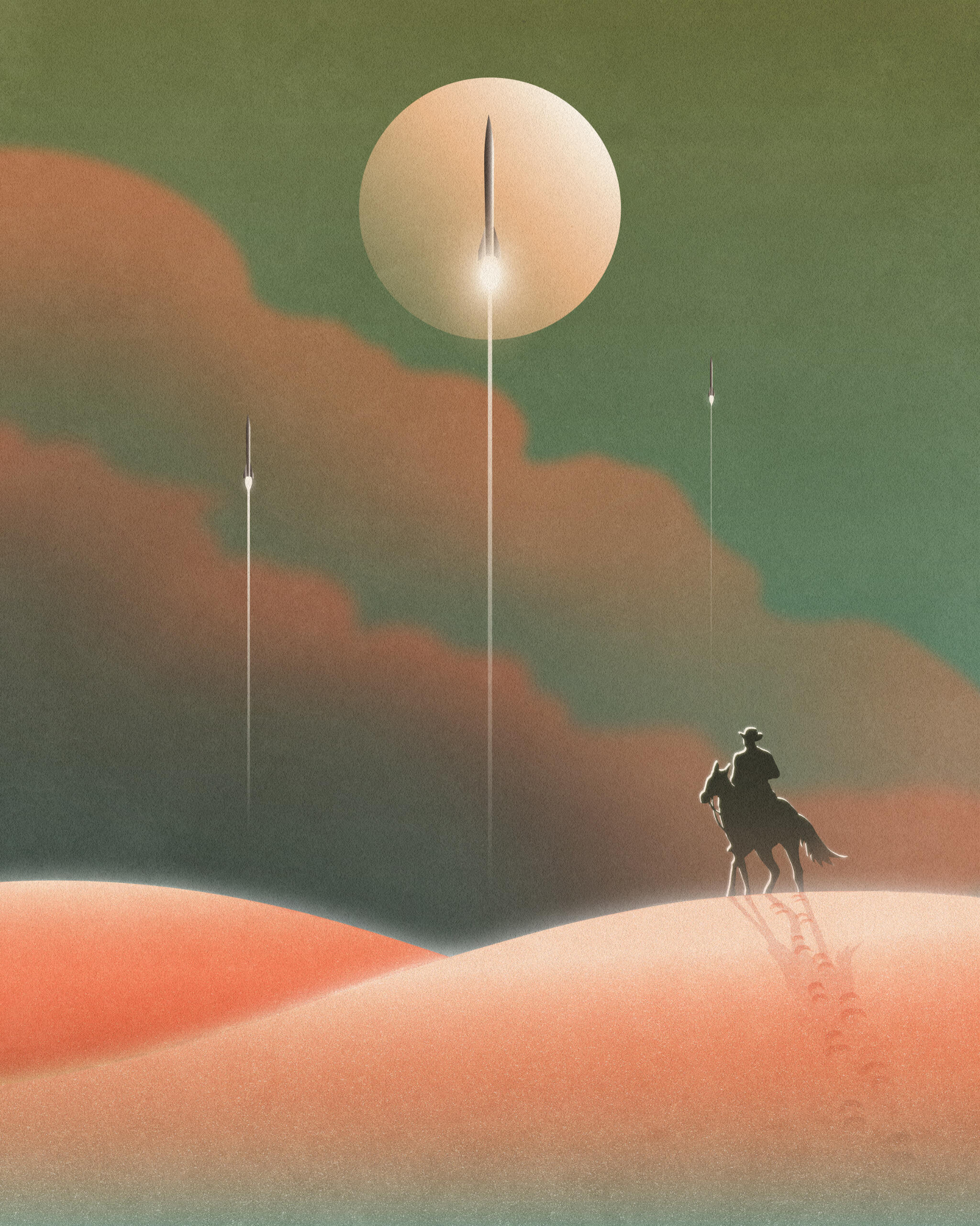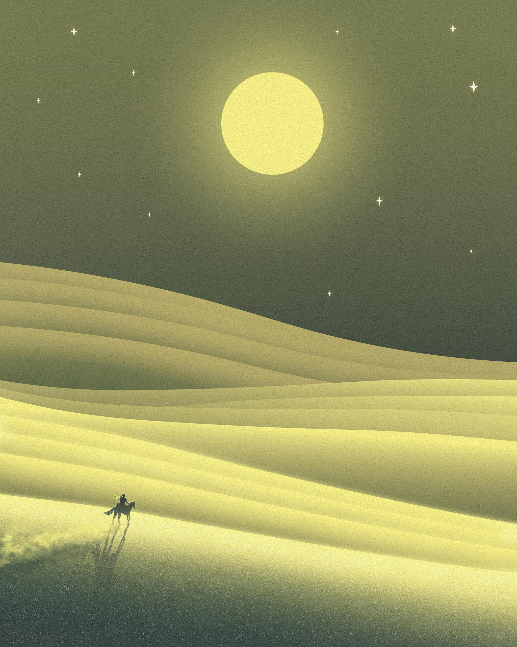 Yet another trip across the poison desert. Stretching into the horizon a sea of toxic sand shimmers an iridescent green in the moonlight. Each lifeless grain a tiny fang waiting to deliver its toxins.Like always, precautions were taken. When traveling here a horse must be fitted with special horse shoes and the rider with special boots. A face covering must always be worn to keep the hallucinogenic dust at bay. Inhalation is always a risk. Just one storm and those who wander across this forbidden land are lost, dissolved into nothing while seeing ghosts.Such a fate was not likely tonight, though. The sky is clear, and the route carefully chosen. Tonight is a good night to cross the poison sands.