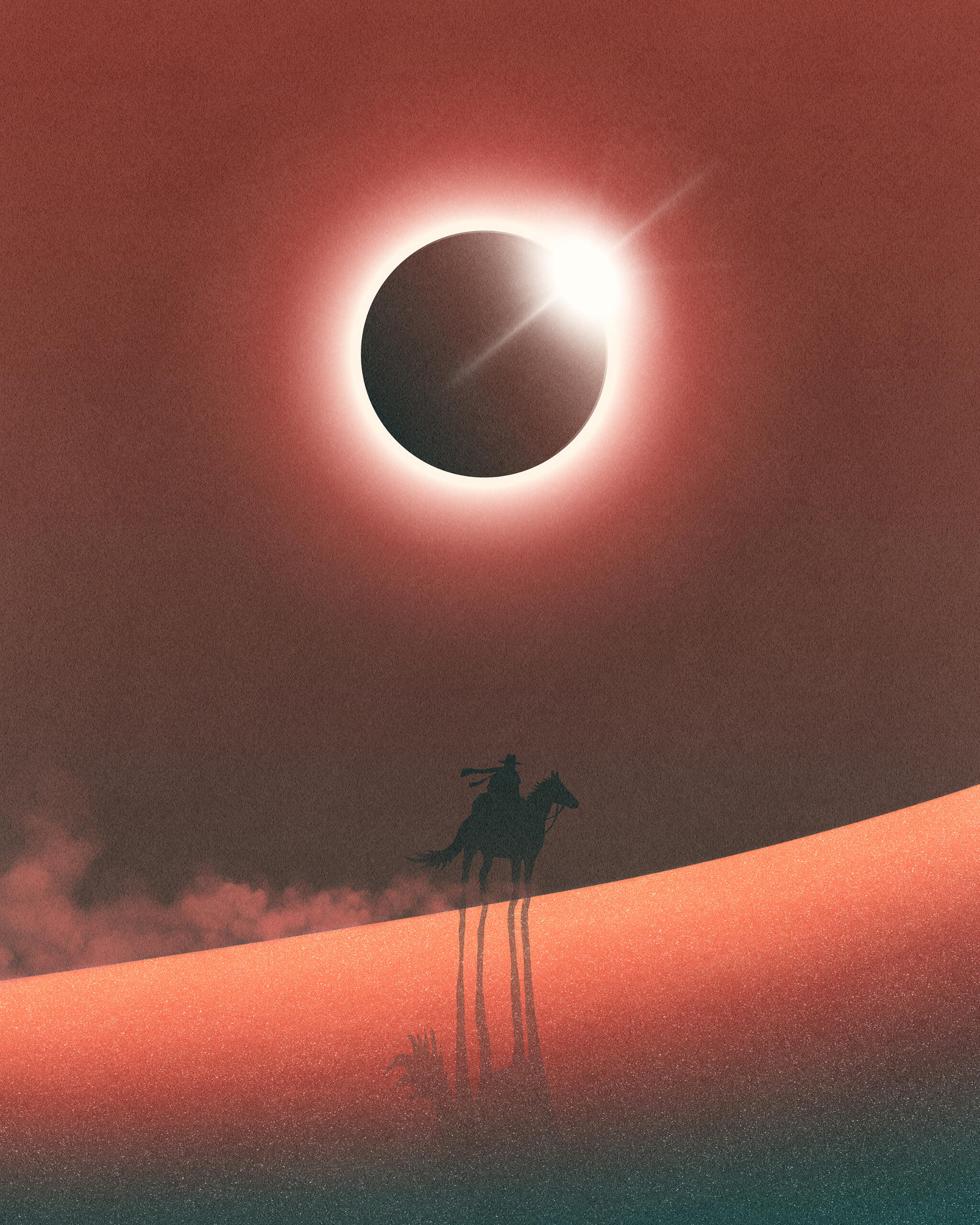 The wasteland fell silent. The wind stopped. He could hear nothing but his heart pounding and his horse breathing.The air had changed. A great blanket of darkness consumed dune after dune until he too was enveloped in shadow. Although it was mid-day, he was now in a twilight world. He checked his timepiece to confirm it was indeed around high noon. It had stopped ticking.Something wasn’t right. He could feel it. His horse could feel it. The desert itself could feel it. Yes, something was very wrong.What was this? Looking up at the now shrouded sun the man asked himself: